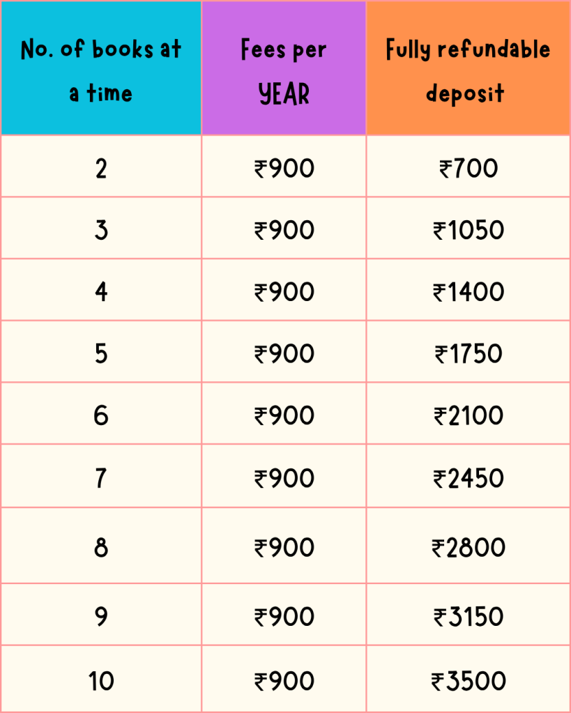 We currently have 370 members. Our happiest members (about 30% of the total) are those who keep a larger deposit (₹350/book) and issue more books at a time. They need to visit less often and their children read more books. Kids are so busy these days that to get the full benefit of the library, we highly recommend signing up for a 4-book (or more) membership. The yearly fee is just ₹900, regardless of how many books you issue, and you can always switch to fewer books anytime during your membership and your deposit will be returned to you at the time of switching.